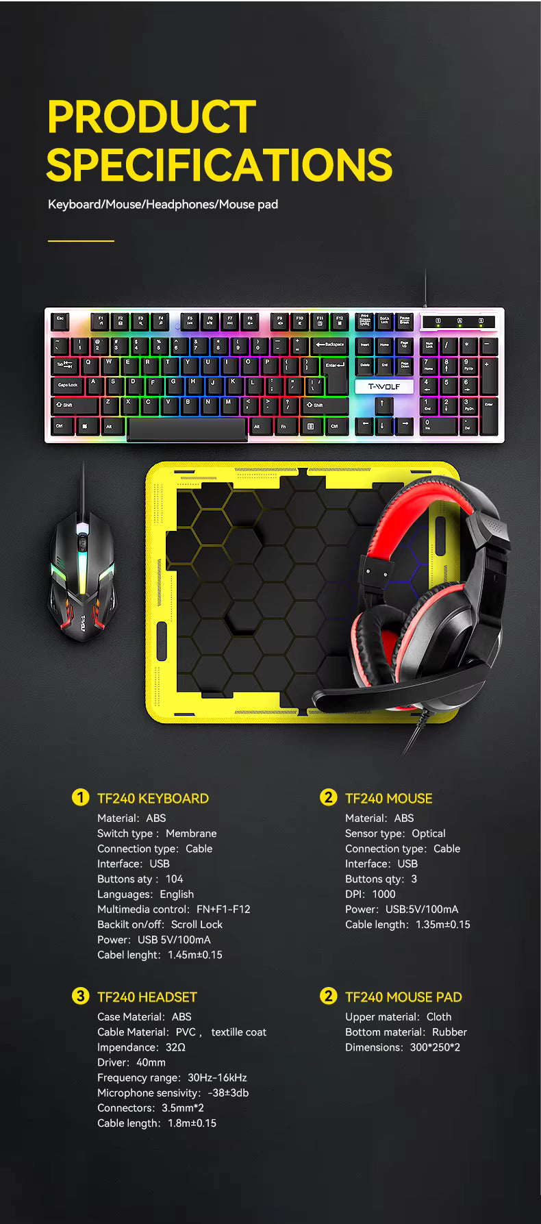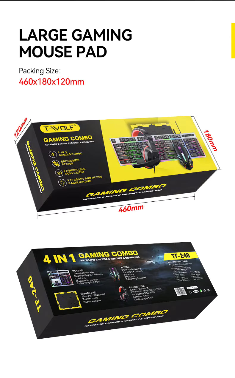 Combo Gamer 4 en 1 con Teclado RGB, Mouse Óptico, Audífonos y Mouse Pad