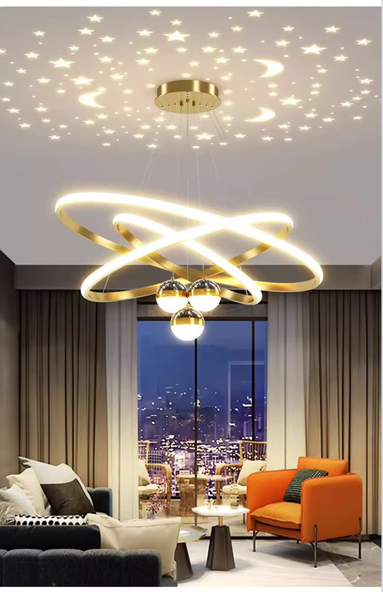 Lámpara de araña moderna de lujo de hierro 85-265V, con 3 anillos (20/40/60 cm) y bombillas efecto luna y estrellas, colgante para comedor y hogar.